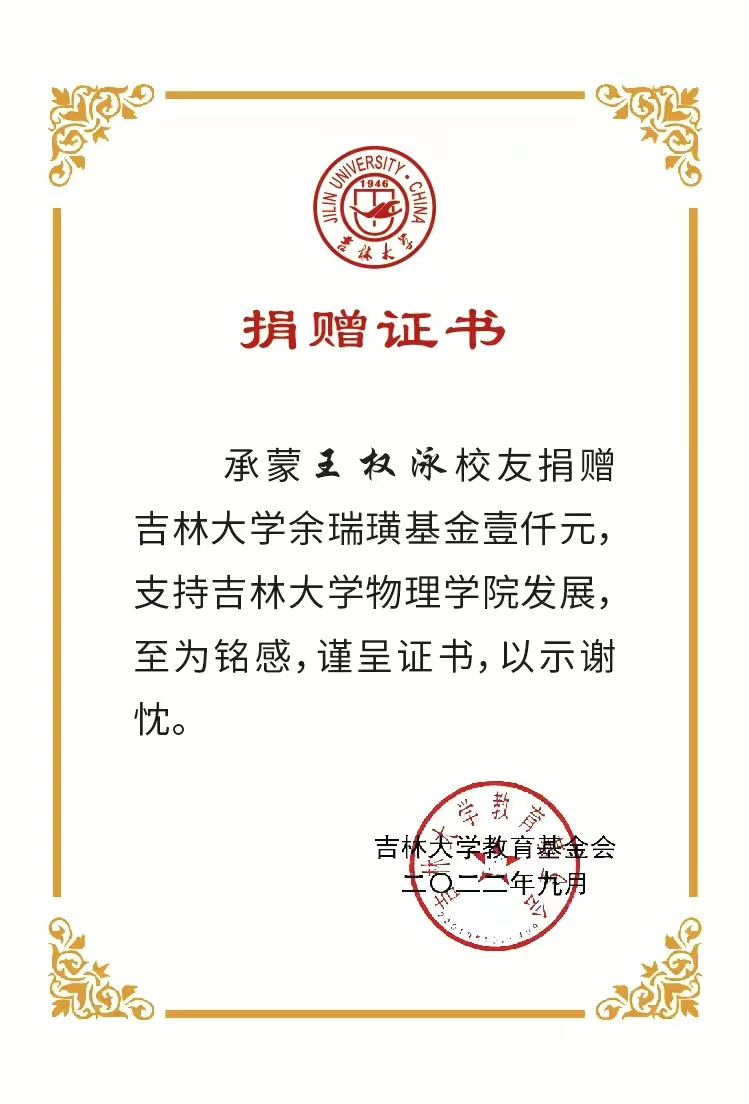 承蒙 王权泳 校友捐赠支持吉林大学余瑞璜基金,特颁此证,以兹感谢!